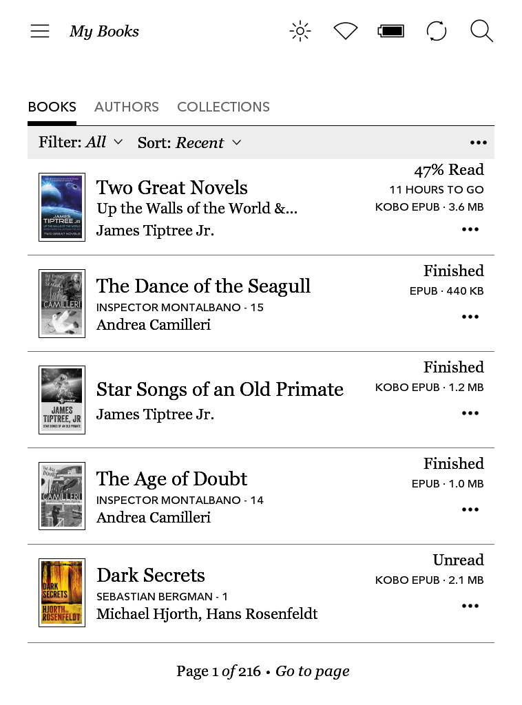 Downloading from DropBox desktop is working again. (Downloading from DropBox mobile still doesn't work.) The books list view displays the book's subtitle in a smaller font on a separate line, like the series title/index. (Previously it displayed inline with the title, separated by a dash.) There is a new(?) option "Swipe left edge to adjust brightness" in Settings > Reading settings. (I think this option could only be set by editing the config file in previous versions, unless I just didn't notice it.) The screen doesn't refresh properly after using the dictionary or highlighting. This had been fixed in the previous firmware version 4.5.9587, now broken again. I don't much like the additions to the books list: The "Go to page" button and "..." menus beside each book just clutter up the display to no purpose, these functions could already be accessed by tapping the page number or long-pressing the book title. The other book information is now squashed up to make room for the useless "..." button. (see screenshot from my Glo below.) |