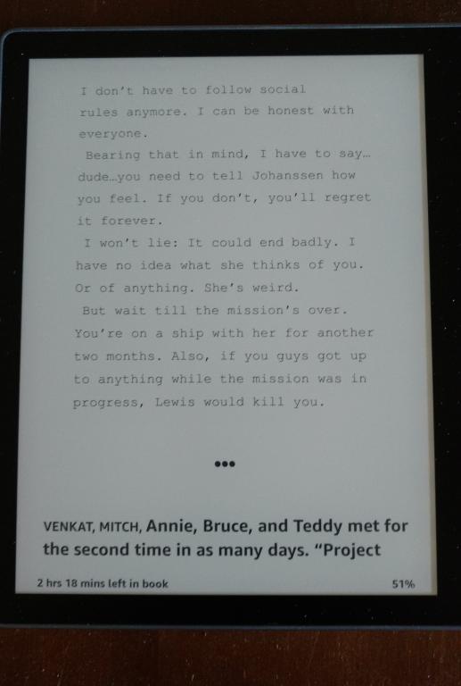 Here's an example of a *really* bad decision on the part of the book formatter. I don't know what font they embedded for this, and to tell you the truth, I don't care what font it is. The only thing I care about is that I had to get up and put on my glasses last night when I was reading in bed, because I couldn't read it without them.