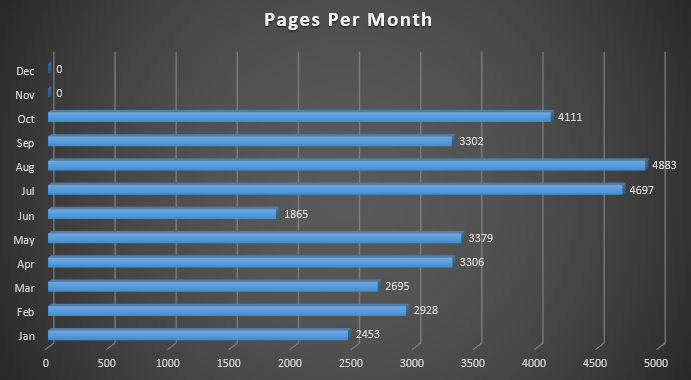 I had a slight drop-off in pages per month this month, but I was on vacation for a few weeks in August, so I think that was the aberration. I think my "drop" this month was more a returning to normal.