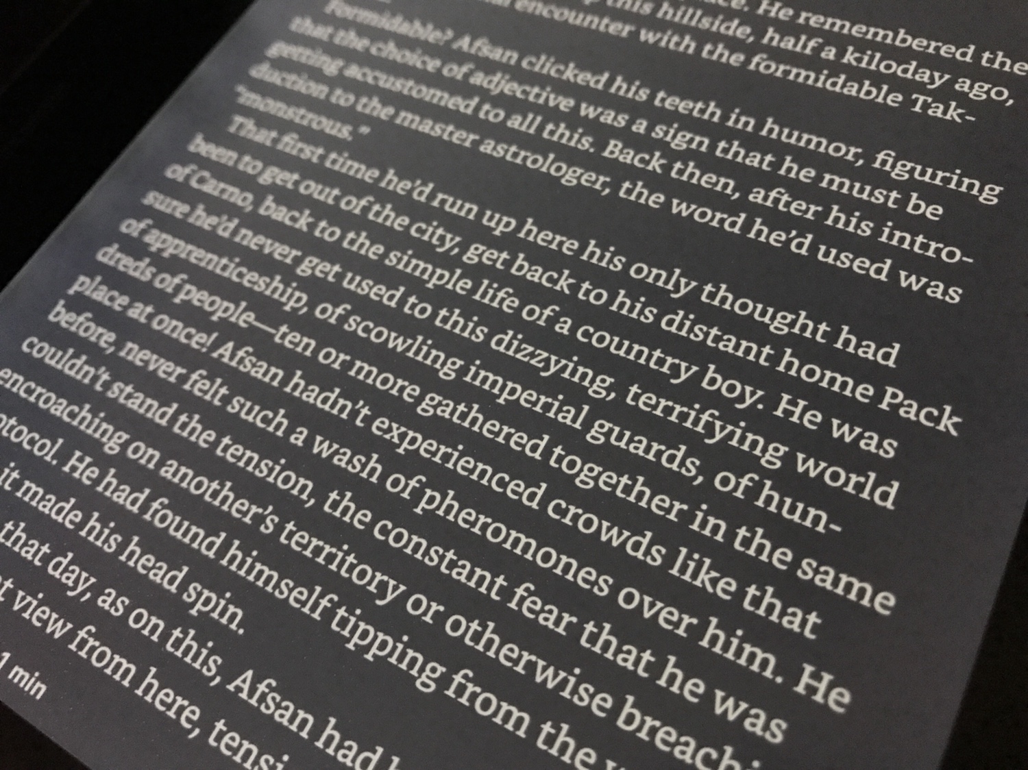 I vastly prefer it to normal black text on white. It's much easier on my eyes. But I don't think I'll like it on e-ink, because the black isn't black but very much grey. White text on black was the norm until the advent of GUI. Movie still often use light on dark GUIs because they look better when photographed. PS: the obvious reason books aren't printed white text on black is you'd be using vast amounts of ink. |