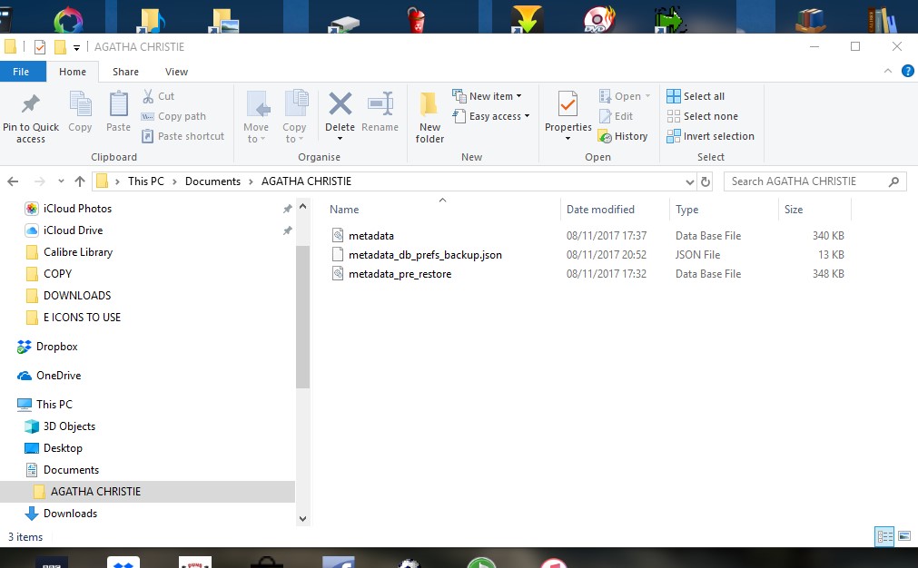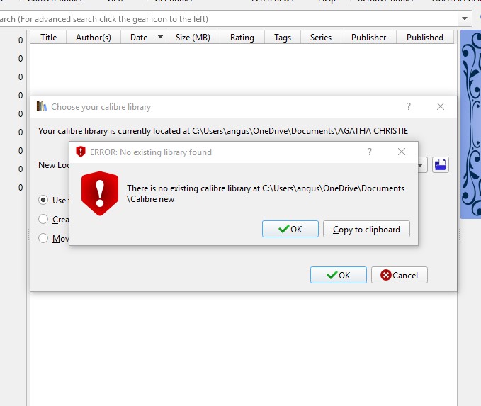 Screenshot 1 is my Documents folder where calibre always sits. The AGATHA CHRISTIE file seems to have been put there automatically when I loaded Calibre programme. Screenshot 6 is whats in it Screenshots 2 & 3 are top and bottom end of the Calibre Library that was automatically in there when new laptop was built from the backup of the old Screenshot 4 I tried by creating a new Folder called calibre Library New but when I put that as the location in " Use the previously existing library at the new location " -- I got screenshot 5 Got to be something stupid that Im not understanding. |