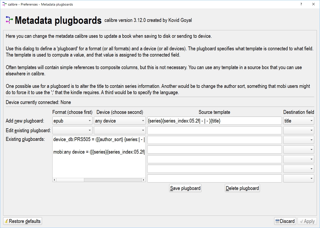 To set up a metadata plugboard, go to "Preferences / Metadata Plugboards". I have mine set up as follows: Format: Any format Device: Any device Source template: {series:|| }{series_index:0>2s|| - }{title} Destination field: title If the book has series information, this prefixes "Series name", then a two-digit series number, and then " - " before the title. If the book has no series information, it leaves the title alone. So, as I said, the first book in the "Miss Marple" series ends up on the device with a title of: Miss Marple 01 - The Body in the Library Last edited by HarryT; 11-12-2017 at 07:48 AM. |
