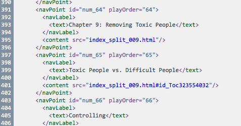 However, I'm getting errors from distributors saying that the TOC is incomplete. I went through my TOC and made sure that all of the (untitled) places were corrected. I also made sure all of my chapters and subheadings were included. Then I manually renumbered all of the play orders so they were sequential. Now, I'm still having the same issue. Is there another place that needs to be changed or updated? Any help is much appreciated. |