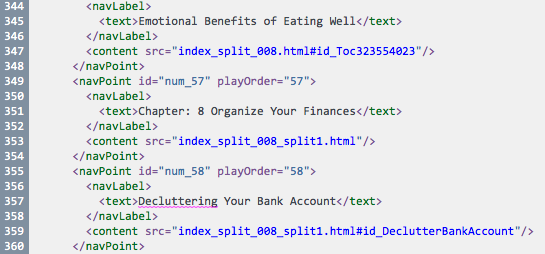 However, I'm getting errors from distributors saying that the TOC is incomplete. I went through my TOC and made sure that all of the (untitled) places were corrected. I also made sure all of my chapters and subheadings were included. Then I manually renumbered all of the play orders so they were sequential. Now, I'm still having the same issue. Is there another place that needs to be changed or updated? Any help is much appreciated. |