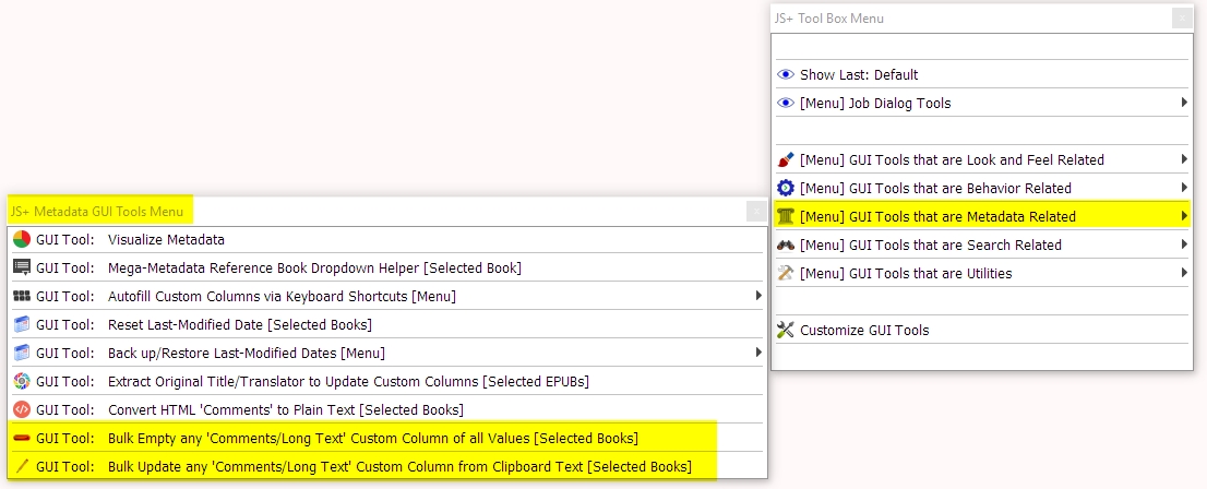 Version 1.0.81 -2017-10-16 Two New GUI Tools: "Bulk Empty any 'Comments/Long Text' Custom Column of all Values [Selected Books]" and "Bulk Update any 'Comments/Long Text' Custom Column from Clipboard Text [Selected Books]".