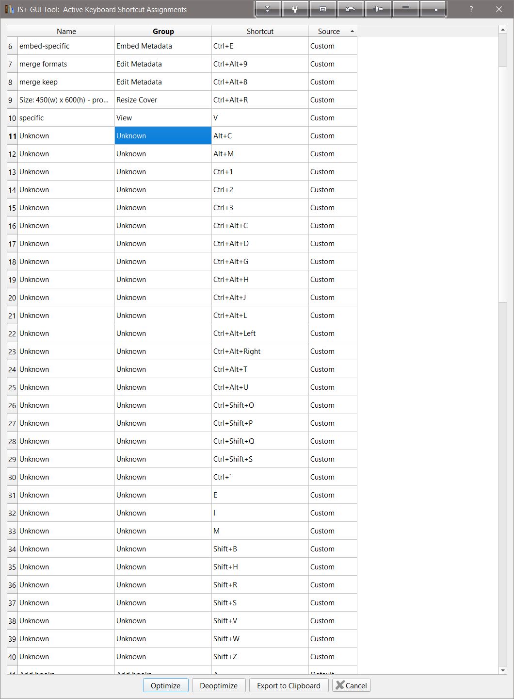 I have fixed the majority of the issues for the next version, but since my installed plug-ins are different from yours, I suspect that some of my issues are a result of my using your main.json without the corresponding plug-in shortcuts having being created during their initialization upon startup. Example: Shift+B It appears in my listing, but with a name that is just the UUID (unique name) of that "action". In my Preferences > Shortcuts, which of course is influenced by your main.json, I have no Shift+B to be found anywhere. I will attach to this post a test version 1.0.99 of Job Spy for you to run to test whether your Shift+B shows up properly in the JS+ GUI Tool Shortcut listing. Regardless, I will continue working on this, but it willl be tomorrow or the next day before I can finish it (personal commitments). DaltonST Edit: attachment removed due to new version. See OP. Last edited by DaltonST; 11-20-2017 at 12:07 PM. |