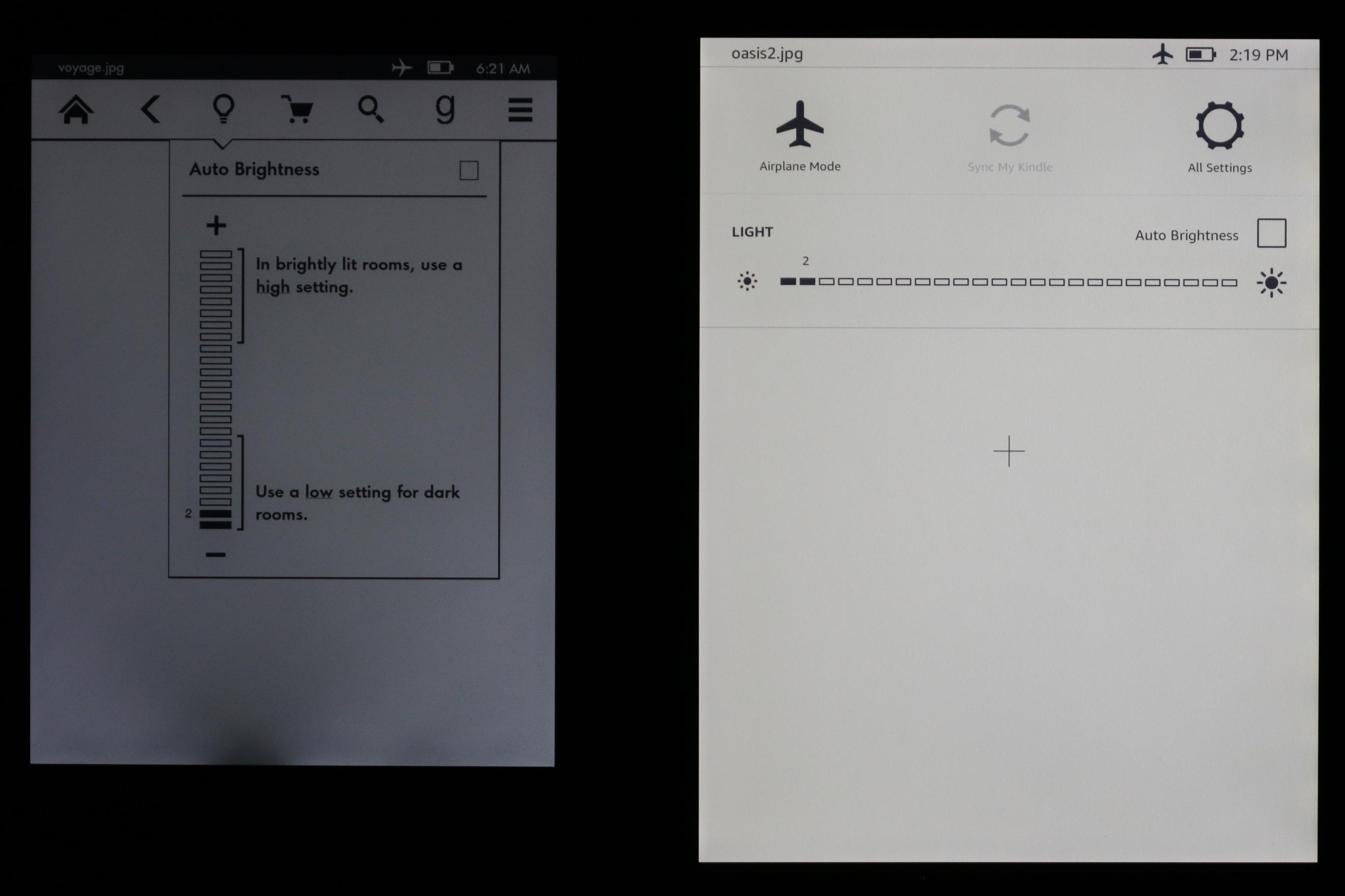 The Voyage is from a few weeks after initial release and it is running firmware 5.6.1 which is neither the initial nor the current version. I am not yet aware of Voyage firmware affecting screen brightness or light distribution. It may be that newer Voyage hardware has less blue in the front light, so these images may be most useful for owners of older Voyages considering an Oasis 2. The Oasis 2 is from release day. It was immediately put in airplane mode and has not been updated from the initial firmware version 5.9.0.6 Post #19 in this thread shows the 5 darkest settings for the Oasis 2 in inverted black and white mode next to a Voyage set at brightness 3. Post #41 in this thread has a video of the Oasis 2 flashing in inverted black and white mode. Code: