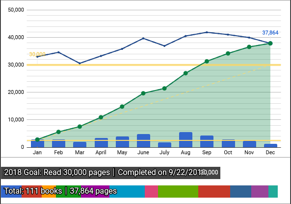 Page Goal: Read 30,000 pages in 2018. Status as of December 31: 37,864 pages read, 111 books/short stories completed. Page Goal Completed 9/22/2018. Final Charts: Overall Summary Stats: