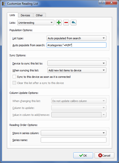 That list should show you all the same books as if you had typed "M/M" into the search bar. But, based on your question earlier, you might want to use something like '#mycustomcolumn:="M/M"'. The name you use is whatever you put into the "Lookup name" when you created the column. Is that what you want? |