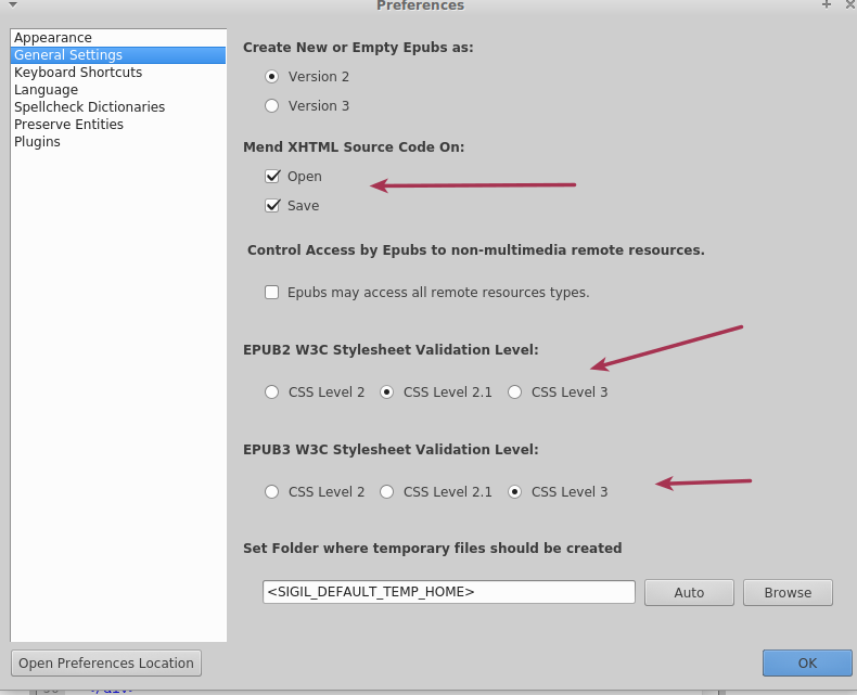 I'm assuming it's good to have the 'Mend XHtML Source code on:' on the Open and Save settings. (see attachment) And the second arrow. I should have the CSS Level 2.1 filled in? Lastly, I don't even have EPUB 3 so I guess that third setting is moot and if I ever do have it it should be on CSS Level 3. And a generic question: What is the difference between: Tools>Reformat HTML>Mend and Prettify All HTML Files and Tools>Reformat HTML>Mend all HTML Files ? As I recall one was the old Tidy and the other the Prettify. The Tidy being super powerful and systemic and best to be avoided, but I'm not sure. Thanks. |