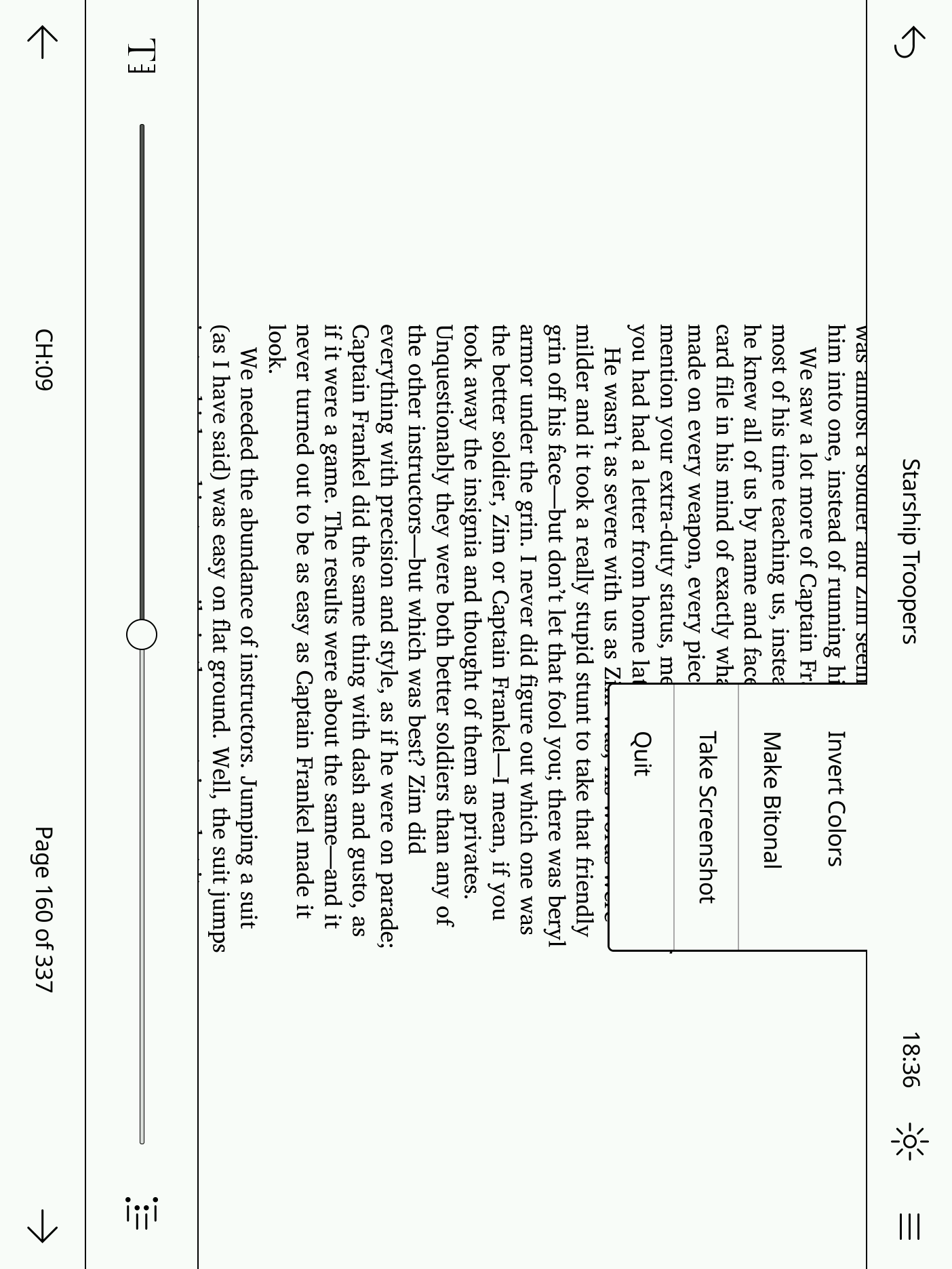 1. After starting Plato seemingly nothing happens but it draws a row of the file selector after tapping it in that row. Missing screen refresh? 2. The display is rotated (lines go from top to bottom). 3. The user inteface input positions aren't rotated. UI comes up by tapping the top of the device, to activate the menu on the user interface I had to tap at the unrotated position (top right corner of the device, while the hamburger menu is at the bottom right corner). Same for page turning. |