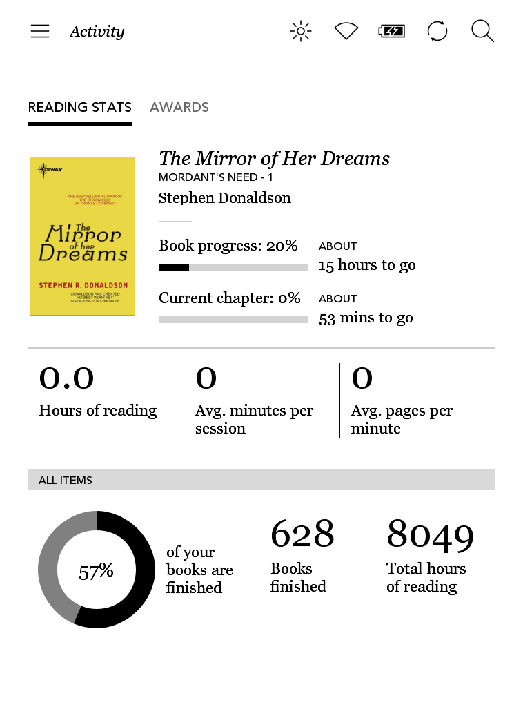The estimated time remaining in a KePub book still works, and seems to be accurate, but the stats for the current book shown on my "Activity" page are all zeros even after I have been reading for hours, and the total hours read has not increased.