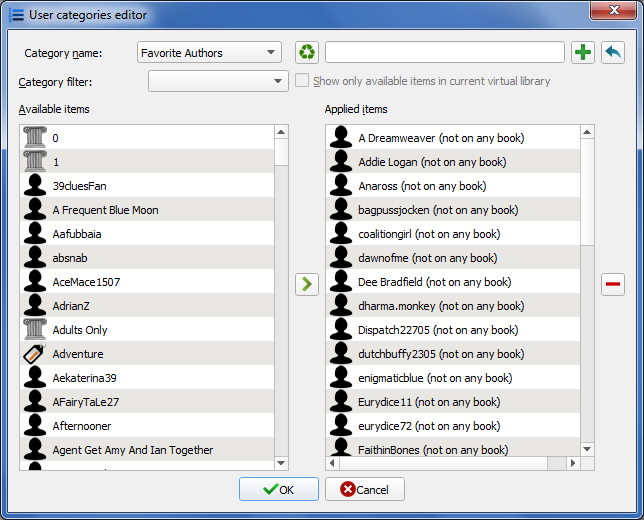 Even though its built-into the core, the User category feature is more like an optional extra along the lines of Reading Lists (and much less used than RLs I suggest). I think I'm right in saying: If you copy books from Library A to Library B the Reading lists in which the books appear in Library A aren't copied to Library B. BR |