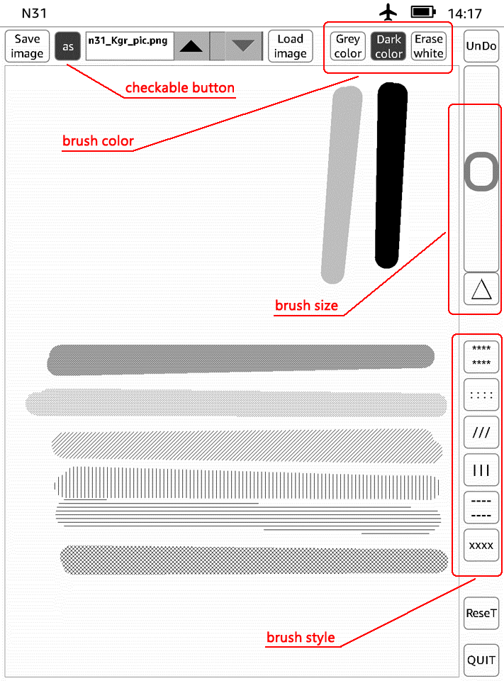 Paint on touch kindle It is written in python (PySide UI frame) that's why install package is large (18mb) Download attachment, unzip and copy folder "n31_Kgr" to your Kindle "extensions" folder, click the button "n31_Kgr" in KAUL, wait seconds ------------------------------------------------ Quick Start : n31_Kgr v0.1 ( Kindle Graffiti) 1. Click buttons on the right panel to change brush style: '| | |', '///' etc 2. Click buttons on the top panel to change brush color: 'Grey color', 'Dark color' 3. Slide grey ring vertically on the right pannel to change brush size 4. When 'as' button is checked, 'save' button function switch to save as mode Click the arrow button to change file names. ( ↑ prevent overwrite ↑ ) 5.When 'as' button is unchecked, save file directly. ( allow overwrite ) Images file path is ( open and save ) : /mnt/us/extensions/n31_Kgr/bin/pictures ---------------------------------------------------------------------------- this version is for Kindle Voyage, Paperwhite3,and Oasis1 Last edited by N31welt; 12-30-2017 at 08:37 AM. |