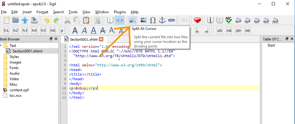 [...] <body> <h2>Chapter 2</h2> <p>Text in Chapter 2.</p> </body> if you want to split each file one-by-one. Or you could use the Insert > Split Marker + Edit > Split at Markers method. In the end, your EPUB should look something like this: |