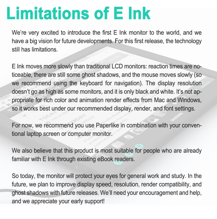 Like for the e-readers or the E-ink technology, some things or assertion must be understood in the culture of this technology.
