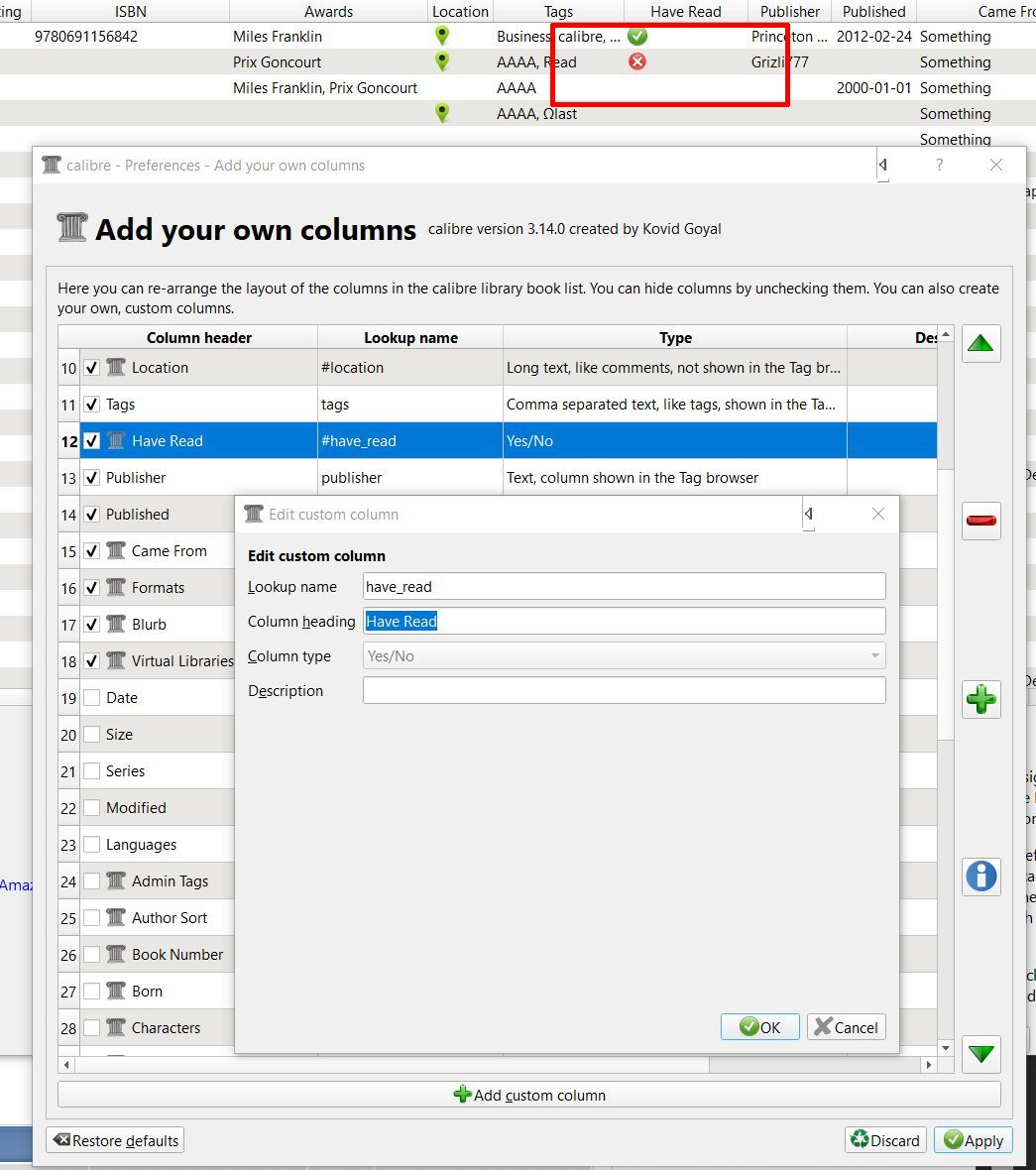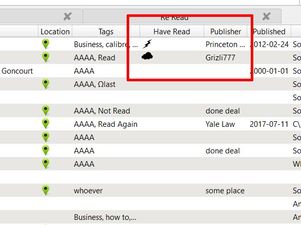 First I set up a have-read/Have Read column which is type Yes/No, then I entered 'Y' in that column for the first book, and 'N' for the second book. By default the column is displayed as a 'green tick' and a 'red cross' respectively.