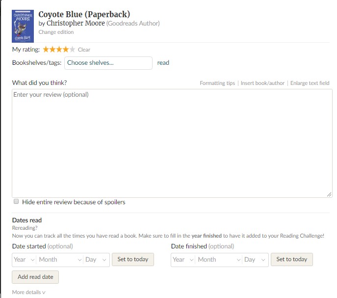 It appears, that if you just add the book directly to the "read" shelf, the date finished will not be accepted. From my testing, if I put the book on the currently-reading shelf and then put it on the read shelf, the date finished is accepted. I've tried several combinations of shelving and reordering the API calls, but this seems to be it. And it agrees with what I have been seeing. When I start a book, I put it on the currently-reading shelve and the appropriate genre shelves I have. That means that when I do put it on the read shelf, the date read is accepted. I'll have a bit more of a play, but, if this is how it works, I'm not sure if there is anything I can do. Or anything good. The workarounds I can think of are all a bit ugly and mean a lot of extra API calls. |