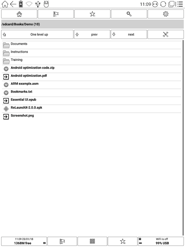 This time I decided to bump up the version to 2.0. Please do not import old settings! Delete existing app. Install fresh and customize the settings. I forgot to keep track on the compatibility and I'm almost sure some settings are not compatible. Importing old settings may cause app crashes. Changes: - Support for Onyx Boox Max2 - Reworked layout for hdpi devices, it was crazy small. - UI speed improvements, not that much but still. - Reworked search screen. - New UI mode (by default): file extension imitating icons. It is possible to revert to displaying icons of associated apps Settings > Advanced Settings >Appearance > Show icons in file list It is faster to draw text than apply icon image but it depends on your device if it makes any visible speed difference. On Onyx all files default to ReLaunchX icon due to Intent action assigned so the new mode looks nicer. As always if you find any bug please report but I cannot promise when I'll touch the code again. Hope F-droid soon update the app. EDIT: Removed attachment as I added it to the first post in this thread for convenience. Last edited by plusz; 02-01-2018 at 09:22 AM. |