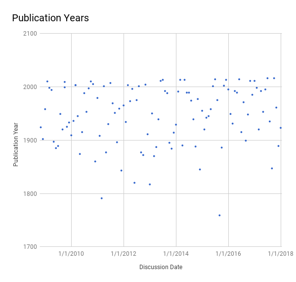 My takeaway is that the books overall were more modern than sometimes believed, but that could be in part because of a skew in the last year or two. The last couple of choices were on the dated side.