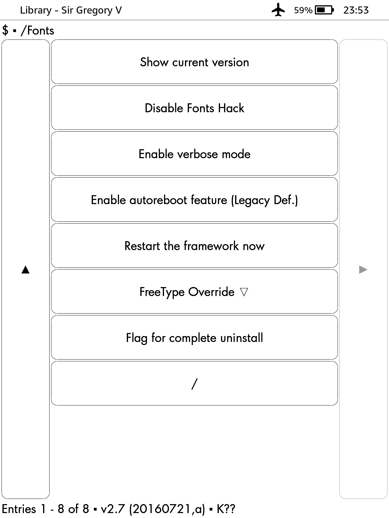 • The font hack, on the other hand, is missing several key options in the "fonts" menu in KUAL? [screenshot attached]