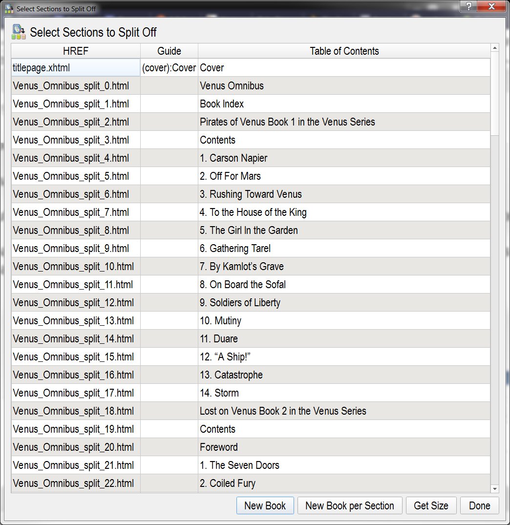 Epub Split seems to be exactly what I require! Thanks for that. But could you also not only show the HREF of the ToC entries, but also the text? "part0003.html#2RHM0-e2106d65dede4aad84f56c1110acb8d1" is much less meaningfull than "Die Macht der Drei" (at least to me)