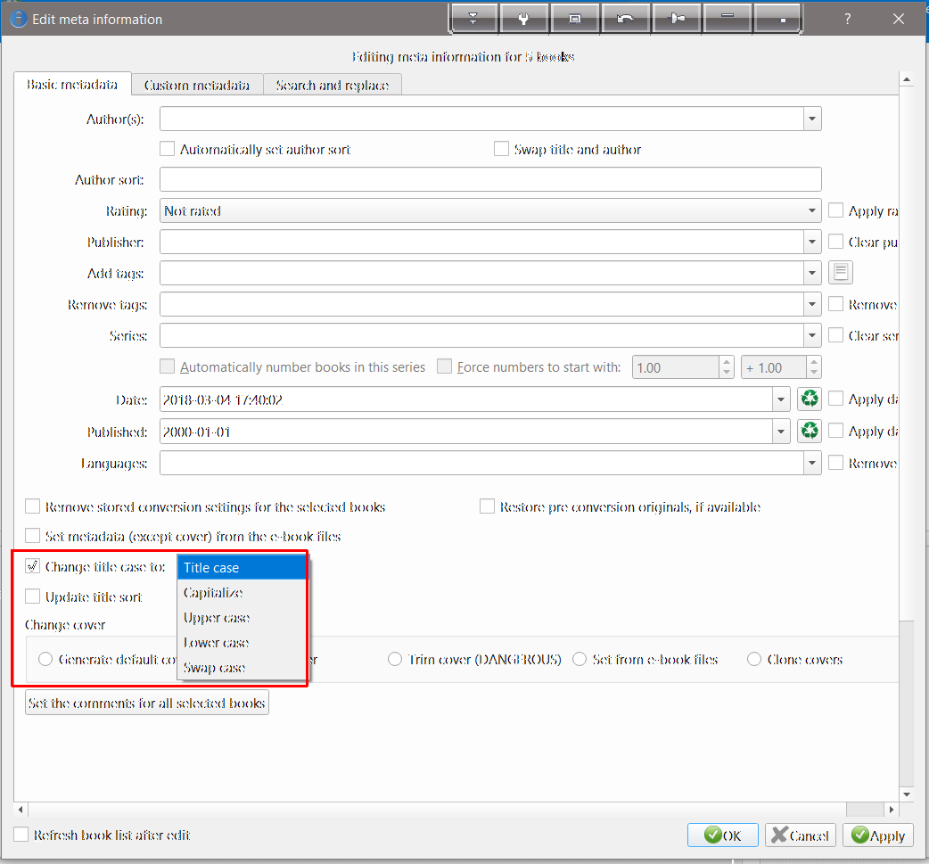 Case change will not bother metadata retrieval. That is case insensitive. <Ninjad by BR > Select and Right click the books that lack 'Title case' Tap 'E" tick the box 'Change (the) title case to": <select type> Note: most mixed case tools have issues if the original was ALL CAPS. Lower first, the case it |