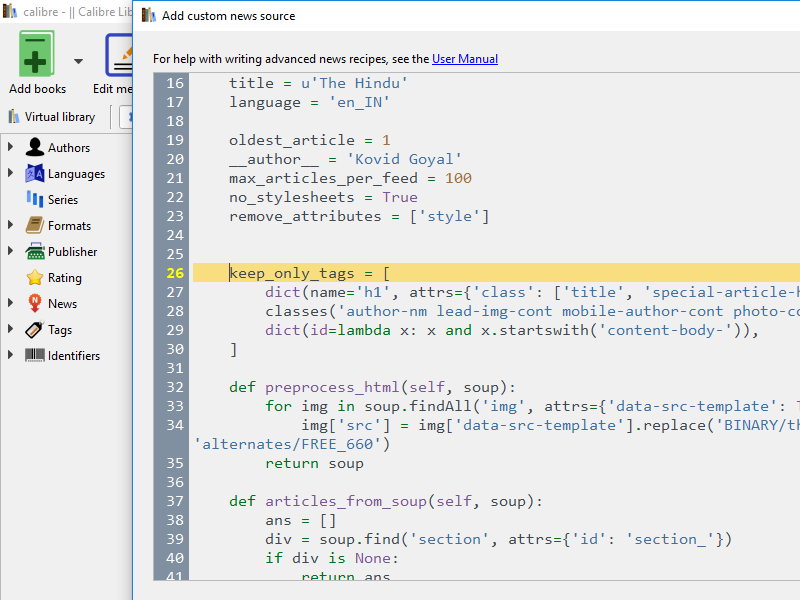 I'm really grateful to you for making such wonderful software which makes reading awesome, and turning e-reading devices cost effective. Issue:- https://www.thehindu.com/opinion/op-...le24646941.ece. Only yes part is being downloaded, leaving No and it's complicated. Such kind of Article comes every week on Friday, in "The Hindu" Newspaper. I'm not from IT background, but I tried removing the the code, ignore_duplicate_articles = {'title', 'url'} It isn't working for me as well, I guess I'm missing something out there. I have read your articles that you work 80 hours a week and you must be very busy, but if you can take out time to upload the recipe here with modifications, That would be helpful, or tweak the inbuilt recipe. ![]()