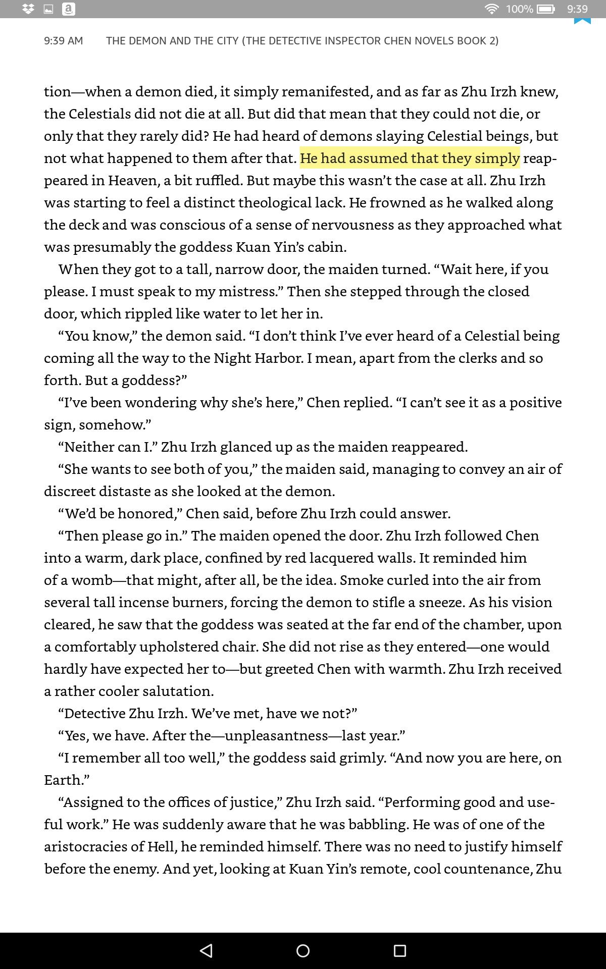 You know, it's not really designed for reading, ironically. It's HD shape, 10" on the long side/axis. It's...awkward, if you want to read, because when held the way I hold readers--portrait--it's damned long. But if you rotate it, you'll have waaaaaaaaaay more than 60chars/line, and your eyes would get very cranky after a while with that much reading without a line-break. I think it would be awesome sauce, though, for playing a show while you're working out, or the like. And the HD? Breathtaking, I'll give them that. Routs the hell out of a "retina display." Hard to fault it. Anyway, back on topic: I'll check random pages, and see if it's just ET, or lucky. I suspect, Turt, that it's the benefits of ET. Amazon does many things, and some things it really spends time on, and the MOBI developments tend to be biggish, when they occur. Hitch |