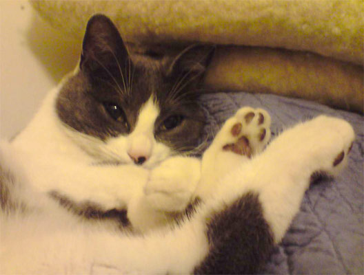krisk, your little devil reminds me of my own devil. here are a couple of photos which show just how difficult it can be to get a little reading done around here. also a couple of photos of my other cat, who is grey and white and therefore takes an excellent photo also she's so cute it's almost unbearable.