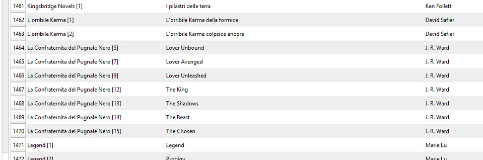 All the books are actually in italian, but you have a point because the metadata in that are not correct: Books number 5, 7, 9, 12, 13, 14, 15 are set to English. Books number 1, 2, 3, 8, 10 are set to Italian Books number 4, 6, 11 are set to Spanish I guess she or somebody must have used the "Download metadata" with too much liberty, so to say. I will see if setting everything to Italian fixes the problem. Yet: 1) I don't see why different languages should cause an issue to series ordering 2) While English book are actually those "set aside" (they all come last after anything els), Italian and Spanish books are mixed in sorting. So this should either not be relevant or showing that something is messy in that part of the ordering alghorhytm. ![]() Language related, books from 1 to 15 goes like that: I, I, I, S, E, S, E, I, E, I, S, E, E, E, E But the way calibre orders it is this: I, I, I, S, S, I, I, S, E, E, E, E, E, E, E (See attached picture to have a clearer idea) |
