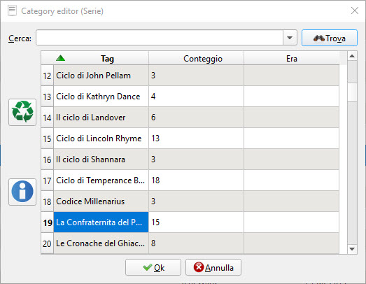 So, she has a series of 15 books, all with their corresponding metadata filled correctly. They are all part of a series she named "La Confraternita del Pugnale Nero", each numbered with a series index from 1 to 15.