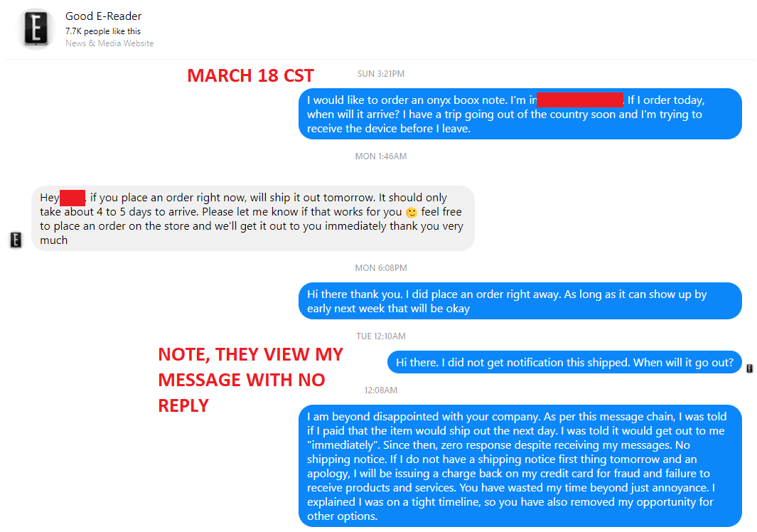 So I message them to check that I can get the item on my timeline, it will go out "immediately" the next day (March 19!) if I pay right away. I pay right away. You can see the rest of the conversation where things obviously don't go that way: