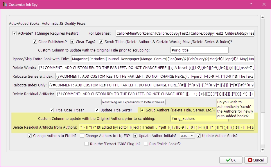 Version 1.0.106 -2018-03-24 Added to the 'Auto-Add Books: Automatic JS Quality Fixes' GUI Tool: Regular Expression fixes to Scrub Titles of newly Auto-Added books.