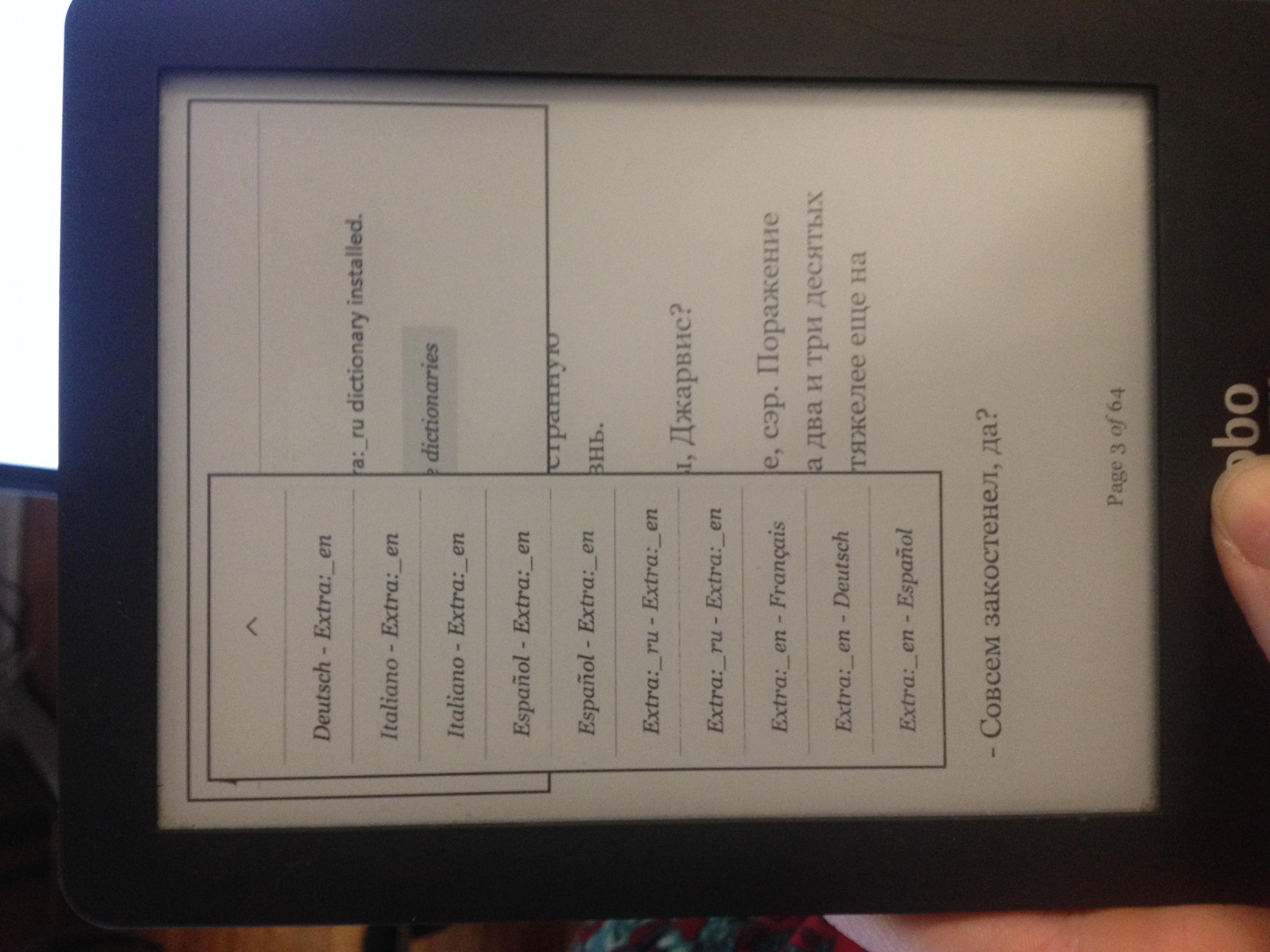 2. If - after a restart - you still see "Extra:_en" instead of "English" then something is wrong. Depending on how much you've already done to customize your reader you could either try a factory reset, update to the latest firmware, install the patched software, and then follow again the instructions to add additional dictionaries. Or: 3. Go back to the original it-en dictionary (copy it back, sync it, or download and sideload it). 4. Restart your Kobo. Have a look at the entries in the dictionary dropdown menu: if everything works as expected ("Extra:_ru - English" entry, when you choose it you're either told that it can't find the definition or you're shown it), great. If not: 5. Open the database, choose the dictionary table, remove the entry for the ru-en dictionary completely, save the database, disconnect your Kobo safely and restart it. 6. Can you now use one of the pre-installed dictionaries (especially it-en) again? Are the entries for English actually shown as "English" and not "Extra:_en"? If yes, edit the database to add the line for the new dictionary again, make sure to use exactly "-ru-en" without trailing spaces, make sure that the size is correct, restart your Kobo afterwards. If not: 7. Do a factoty reset and start all over. Last edited by taos; 03-31-2018 at 03:35 AM. Reason: clarification |