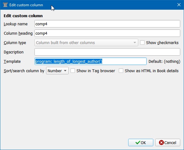 I have set a custom column Author Length (#AL). this column populate with a numeric value, corresponding to the length of fields Authors. #AL as I have it is not very useful. Is there a way to make #AL show not the length of the field Authors, but instead, the length of the lengthiest author of field Authors? Example: Authors = A. Star & Jessica Nicholls & Dariel Raye & Mia Darien & Abigail Owen & B. R. Kingsolver #AL = 87 What I want to have: #AL = 16 (Jessica Nicholls and B. R. Kingsolver are both 16 characters long, while A. Star is 7, Dariel Raye is 11, Mia Darien is 10 and Abigail Owen is 12 Why do I want this? So that a book with Authors "A. Star Jessica Nicholls Dariel Raye Mia Darien Abigail Owen B. R. Kingsolver" will show #AL = 77 and by that high value I can easily correct the Authors field. Thank you very much in advance for your time and your help.  |