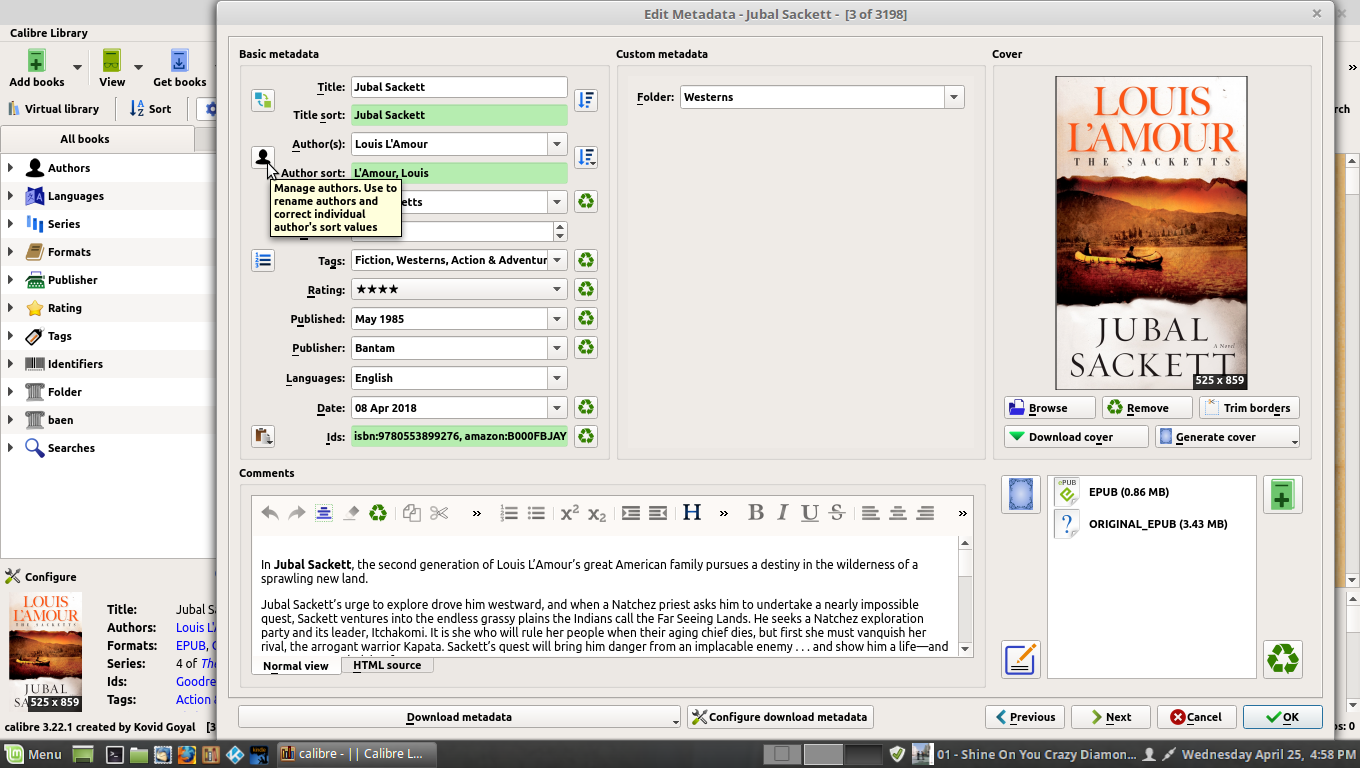 (Note that the setting for MOBI output is used even if the book is in AZW3 format.) -------- Kindles sort by whatever is in the author field of the copy of the book on the device, but will unwrap a name containing a comma for display purposes. For example: "Smith, John" sorts by "S" and displays as "John Smith" If the author field is instead set to "John Smith" it will sort by "J", but still display as "John Smith". Last edited by jhowell; 04-25-2018 at 07:39 PM. |
