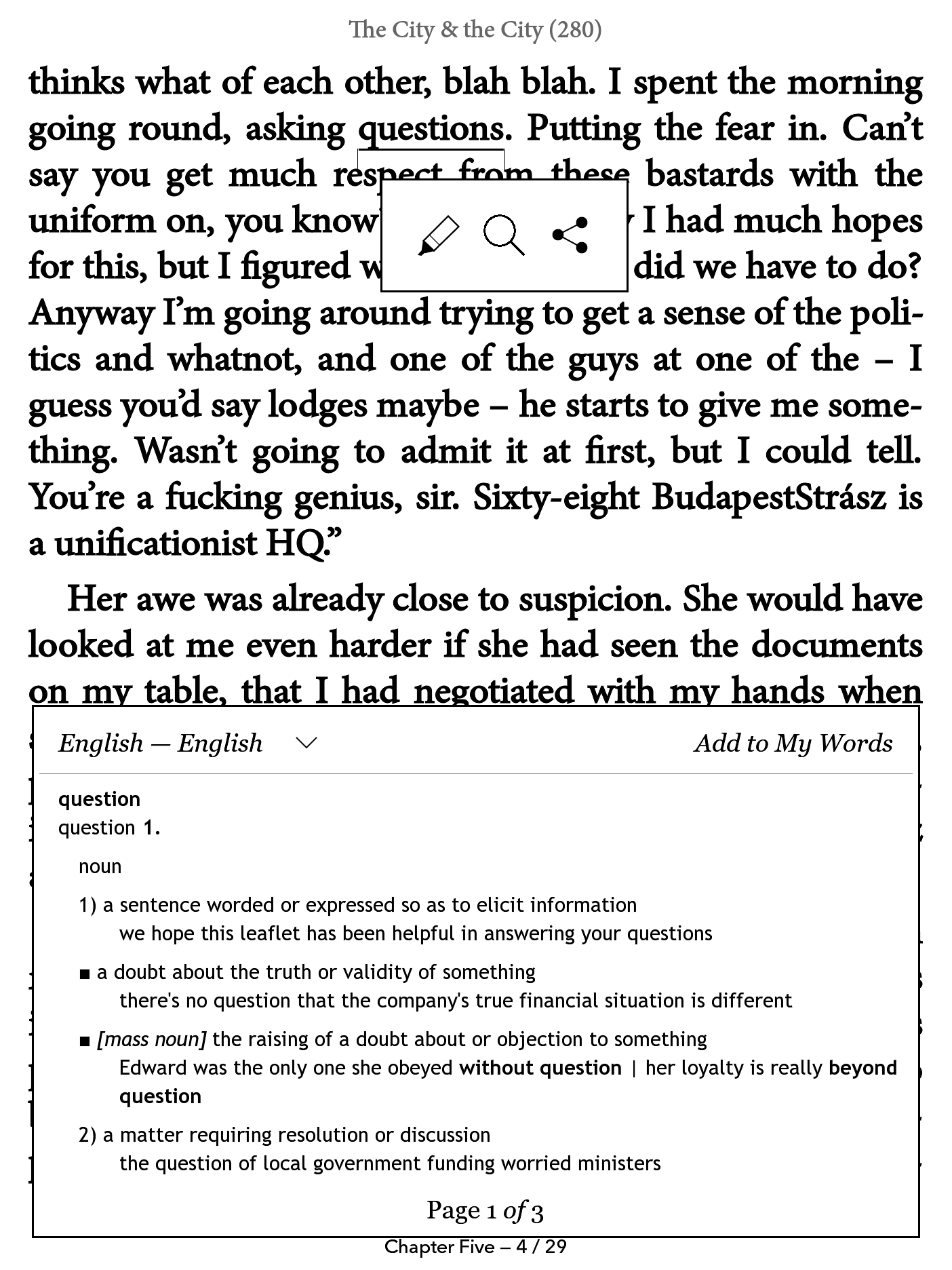 The side-loaded dictionaries that I need to read Spanish are still on the reader (as I see on inspection) but are no longer available for consultation. I cannot access them directly from a book nor by going to the dictionary list. i have closed down the reader and rebooted it a couple of times to no avail. I have not yet had the time to take these dictionaries off the reader and put them back as suggested above. Any other solutions tested successfully would be very welcome, as access to multiple dictionaries is a very necessary feature for me I would also like to ask if there are now other solutions to allow using more dictionaries on the Kobo. The last time I asked I was given some helpful advice which allowed me to add a couple more dictionaries by using the "dicthtml-en-en.zip" type name to have more than one English dictionary for example. These are the ones that are now unavailable. However, as far as I know, it is still totally impossible to have more than two dictionaries per language using this system and this is extremely poor, given the restricted nature of most available dictionaries. The last time I asked about allowing several dictionaries using more complex names, such as dicthtml-en1-en.zip or dicthtml-en2-en.zip etc. or something of this kind, this idea was rejected out of hand and not given any consideration whatsoever. If anyone can give me an update on this, I would be very grateful. Best to all, Rojofo. |