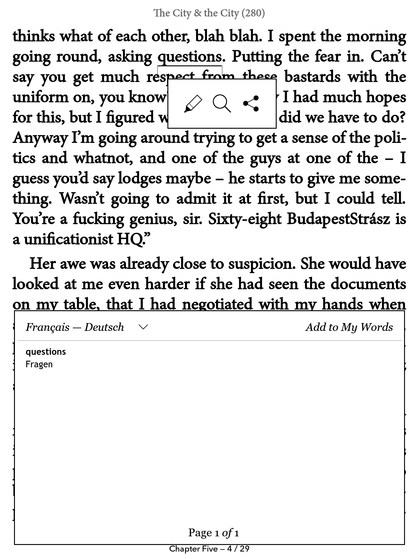 1.) Copy the dictionary file to .kobo/dict -> reboot -> there's no entry in the drop-down menu for the dictionary look-up. 2.) Then add the dictionary to the KoboReader.sqlite database in the Dictionary table under a "wrong" name ("French - German") -> save the database -> reboot -> there's now a "French - German" entry in the drop-down menu -> choose this dictionary -> error: "You don't have a English dictionary installed." 3.) Now change the name in the Dictionary table of the database to the correct name ("Français - Deutsch") -> save -> reboot -> there's now a "Français - Deutsch" entry in the drop-down menu -> choose this dictionary -> no error, look-up works without a problem Edit: jackie_w was a little faster. For me, the additional entries in the Dictionary table survived the update. However, with older firmwares you actually didn't have to add an entry in the database to get them to work. Additional information: It's now possible to have en1, en2, en3 etc. as additional dictionaries if you add them to the "ExtraLocales=" line in Kobo eReader.conf. The two character limit seems to have vanished. This might be because now the firmware seems to no longer compare the two character ISO language codes but the actual strings of the name in the database table. Last edited by taos; 04-27-2018 at 01:27 PM. Reason: just looked up the actual error message |