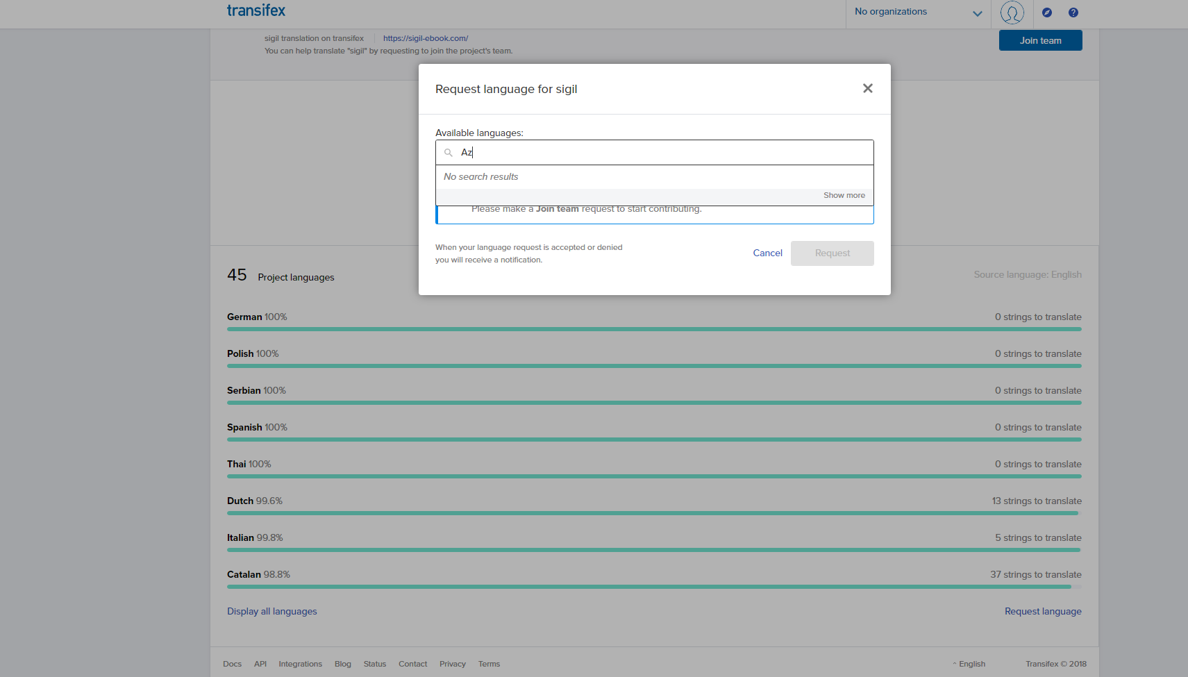 Project language request accepted: Your Azerbaijani (Azerbaijan) language request to project sigil was accepted. But i can't add translations. Azerbaijani (Azerbaijan) 0% 2,986 strings to translate Thanks. |