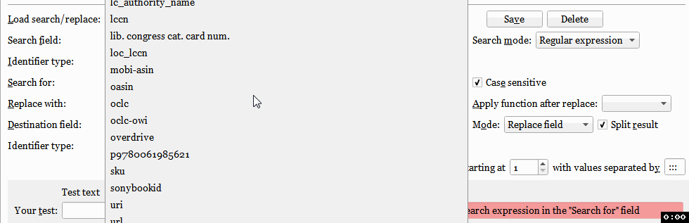 example type: 978000123456/978000123456 identifiers:"=urnisbn/978000123456:" identifiers:"=urnisbn/:" is there a search/replace regex or a way to keep the isbn and removing part of identifier or change. 978000123456/978000123456 >>> isbn:978000123456 urnisbn/978000123456 >>> urnisbn:978000123456 if anyone have another rules to share about managing identifier is welcome. |