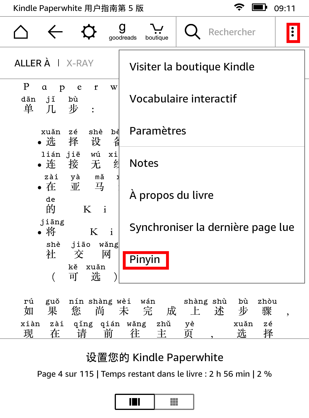 Books in chinese language (such as the Kindle User's Guide Chinese Edition in these screenshots) will (unsurprisingly) display pinyin above chinese characters: And have an active pinyin level menu: The feature doesn't seem to be implemented in a way similar to wordwise. I couldn't find an equivalent of the mnt_us/system/kll/kll.en.en.klld wordwise data base with accompanying mnt_us/bookASIN.sdr/LanguageLayer.en.ASIN.kll in the sdr directory for the book. By curiosity, has anybody researched how/where pinyin is implemented? |