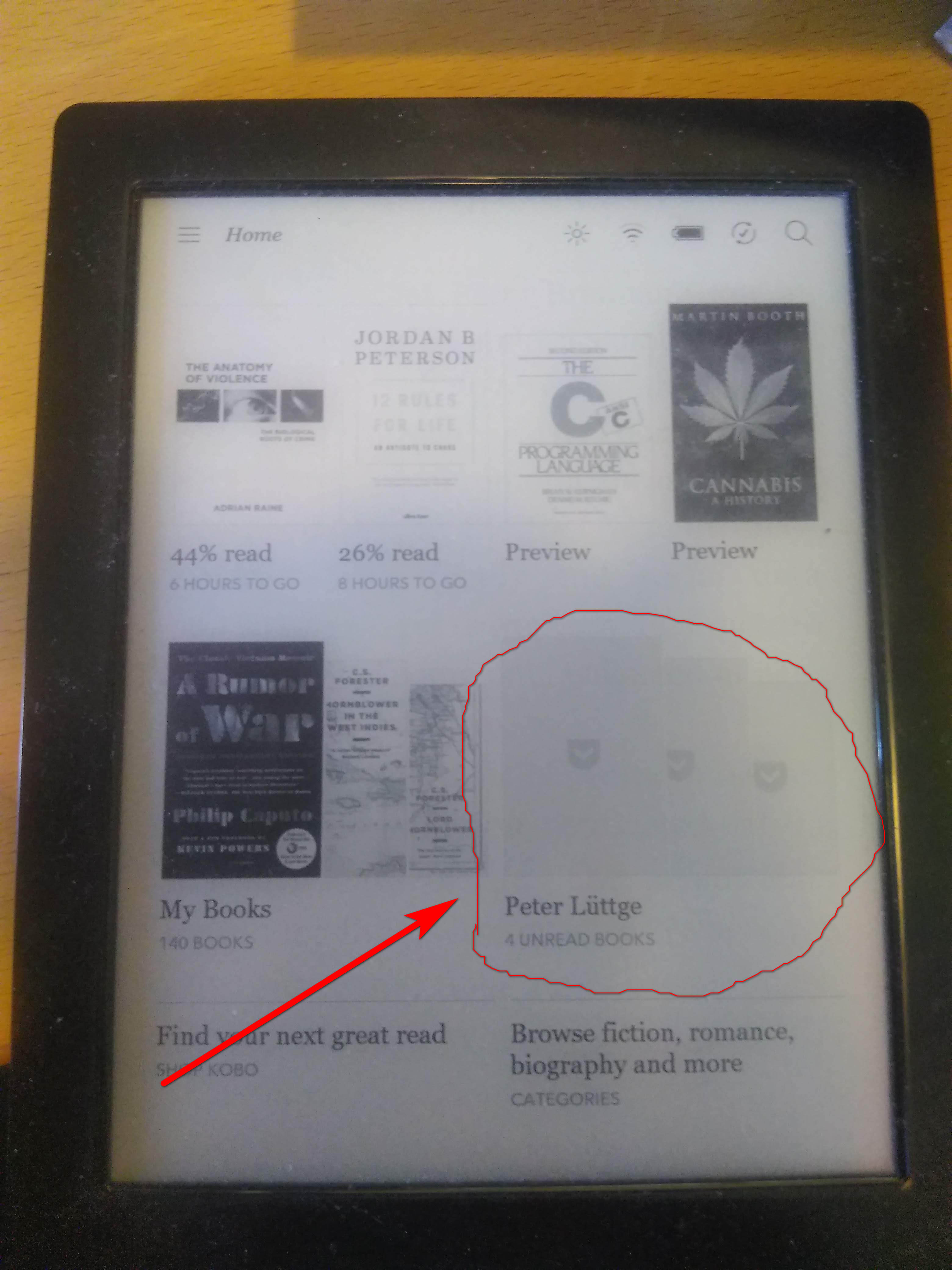 It suddenly appeared on my home screen ("Peter Lüttge 4 UNREAD BOOKS"). "Nothing fatal but sure is annoying. Clicking opens an empty page with the name "Peter Lüttge" on the top left. Should I reset the device using a paper clip? Kobo H20, software version 4.8.11073. Last edited by eric_d; 06-28-2018 at 07:24 AM. |
