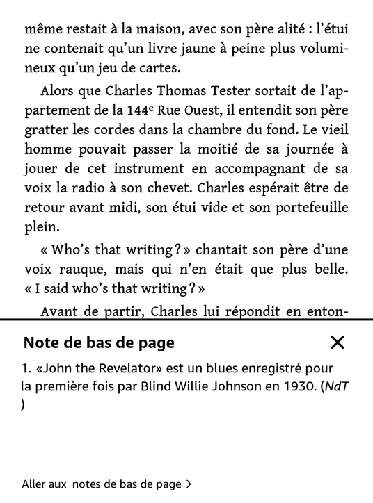 No body font is declared. The reader may use what he wants. <p class="xxnote"><a href="part0003.html#back1" id="call1">1</a>. <span class="gg">«</span>John the Revelator<span class="gd">»</span> est un blues enregistré pour la première fois par Blind Willie Johnson en 1930. (<i class="ital">NdT</i>)</p> |