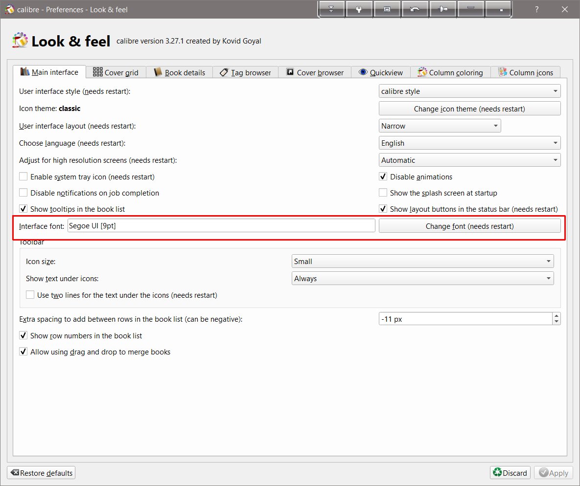 I have a macbook from Mid-2012 with non-retina display. Both the GUI and the ebook-viewer are difficult and tiringly to look at. I find it hard to understand why apple removed the above mentioned font feature. There are however some geek tips to fix blurry fonts and enable subpixel antialiasing: https://www.howtogeek.com/358596/how...-antialiasing/ Cheers Chris |