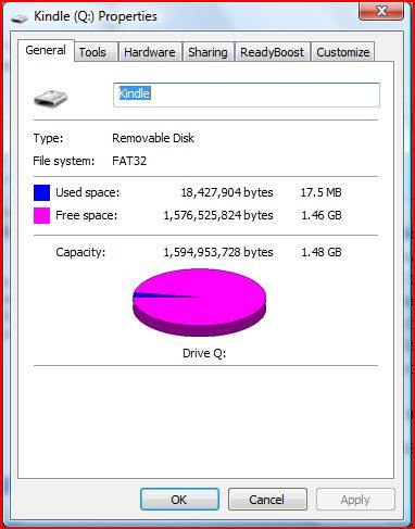 I double checked and I still had over 500MB showing as free in both Windows Explorer and Calibre. I deleted a few files and now Amazon sent me the content. So, this means that you effectively have far less than 1.4GB storage or maybe it's also limited by the total number of files. I'll have to move some MP3s over and see what happens. Still wish I had my SD slot. |
