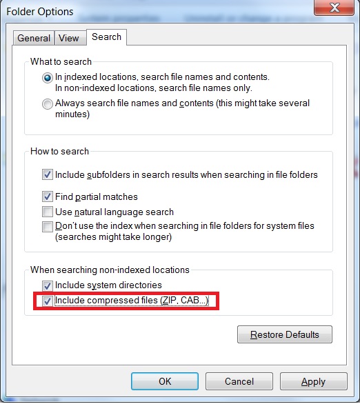Oh, I just remembered that I also specifically set that the search should include compressed files (Computer -> Tools -> Folder options).