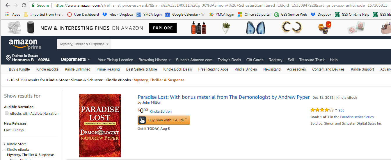 That is really bizarre, because it definitely works for me. If I take @keithdt's link from the first post (the general one, not the non-fiction one), and add &node=157305011 at the end, it goes from showing me more than 2,000 S&S titles (you can see this up in the upper left corner of the page) to 399 titles, and it adds the category "Kindle eBooks : Mystery, Thriller & Suspense" in burnt orange text. See the attached screenshots of before and after, with URL, and search results in upper left-ish.