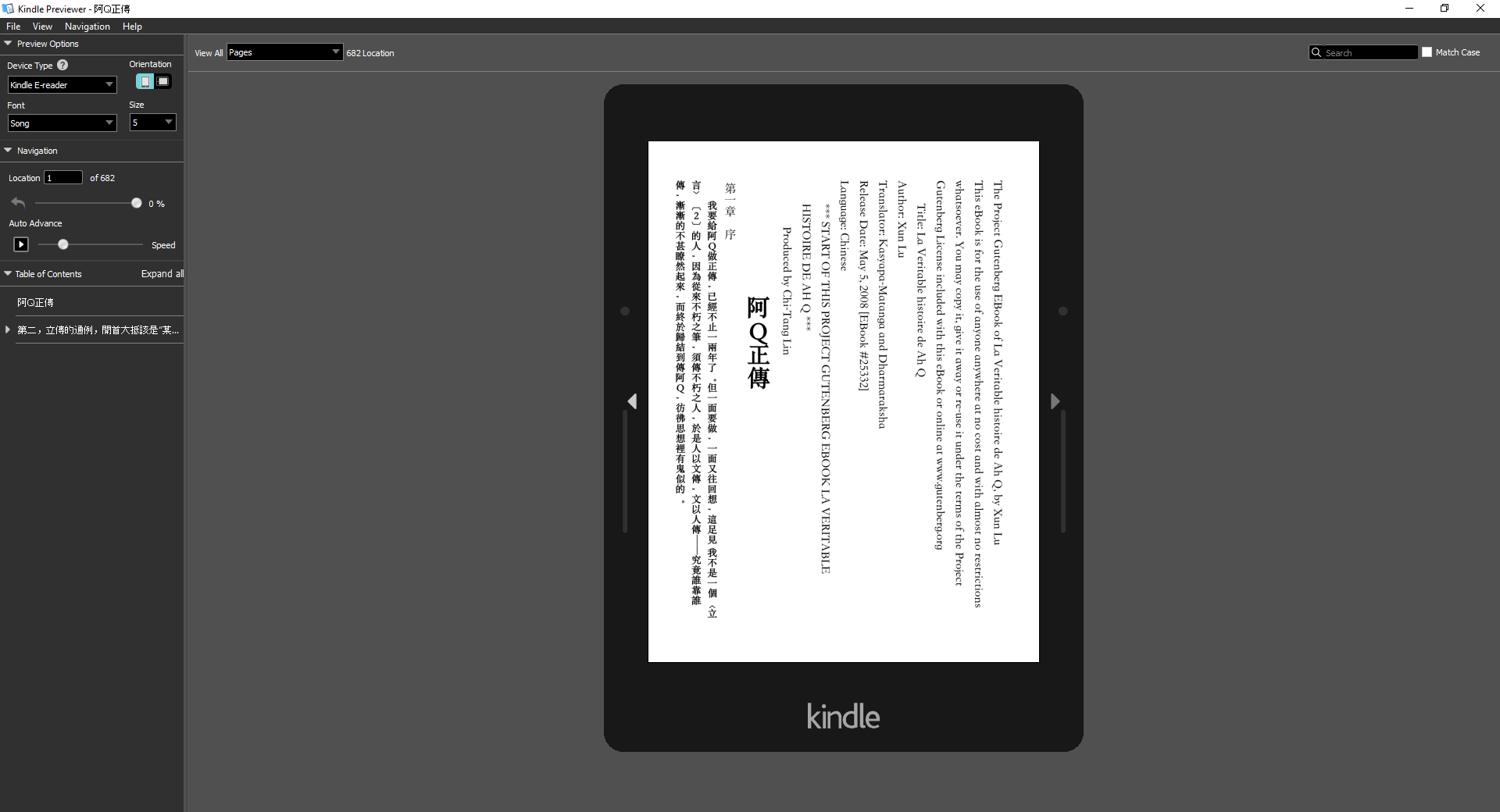 Please try loading the attached public domain EPUB file of 阿Q正傳 from Project Gutenberg on your Kobo and see what happens. On the Kindle, the double-space Latin characters are vertical and the normal space Latin characters are tipped on their side. This is the correct presentation. For the command line to recursively convert all EPUB files into vertical traditional, Taiwan EPUB file try the following command. It will walk down your file structure, convert every EPUB file, and save the converted file in the same location but with a "T" suffix (e.g. 阿Q正傳.epub -> 阿Q正傳T.epub). The original file is unchanged. Code: