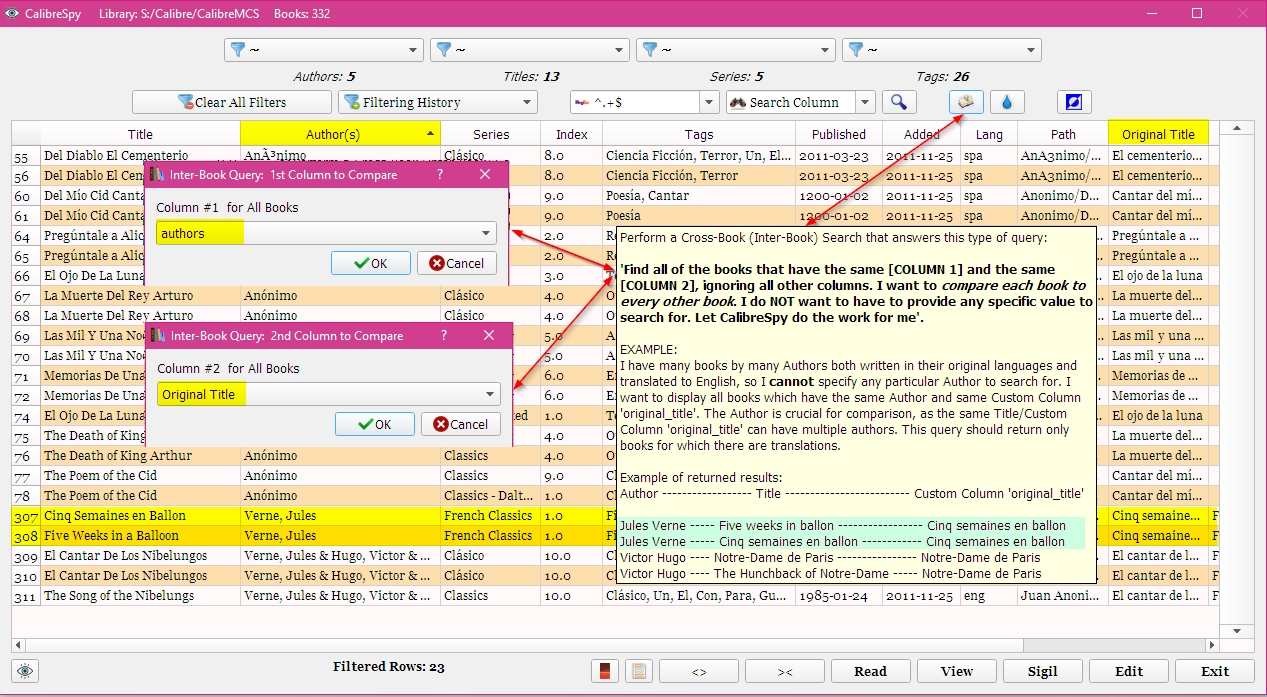 Currently I run multiple version 2 calibre servers to achieve a similar result. It works but having and running multiple versions of calibre is something I'd rather not do, and I really don't like browser based applications. But, I need to have multiple calibre libraries open simultaneously with the Library Management (LM) program (calibre.exe), except the one that it has open. I appreciate there'd be an issue if the LM switched to another library - maybe that could be disabled if CalibreSpy was active. Is that something you'd consider? And if so, would it be feasible to display additional columns. And a word of thanks for providing yet another innovative and useful addition to calibre. BR |
